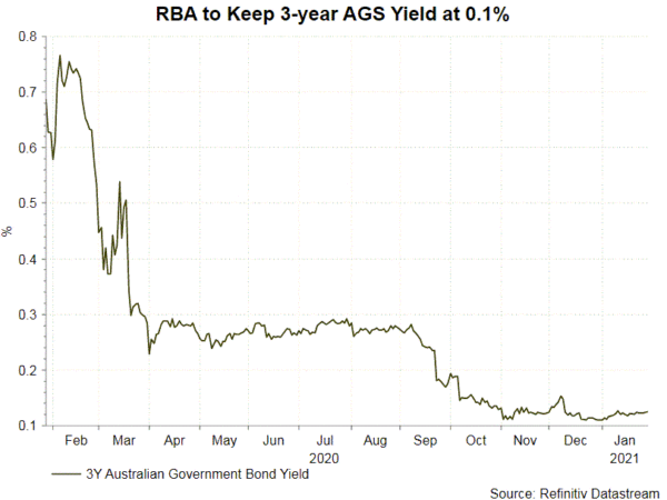 Về chính sách tiền tệ, nhiều khả năng ngân hàng trung ương sẽ để tỷ giá tiền mặt ở mức thấp kỷ lục 0,1%. Mục tiêu đối với lợi suất trái phiếu chính phủ kỳ hạn 3 năm và lãi suất trên các bản vẽ mới theo Cơ sở cấp vốn có kỳ hạn sẽ cũng ở mức 0,1%. Đối với QE, RBA cũng sẽ giữ quy mô mua tài sản ở mức 100 tỷ AUD trái phiếu chính phủ có kỳ hạn khoảng 5 đến 10 năm cho đến tháng 5.