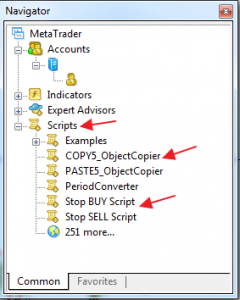 Các script là các chương trình sử dụng khi được yêu cầu, do đó bạn cần phải load script vào chart mt4 thì nó mới có thể thực hiện đúng chức năng. Bạn có thể cài đặt phím nóng cho script để thực hiện thao tác thẳng trên bàn phím. Cách thủ công nhất để dùng script là bạn sẽ kéo thả script từ tab navigator, xem hình mình họa: