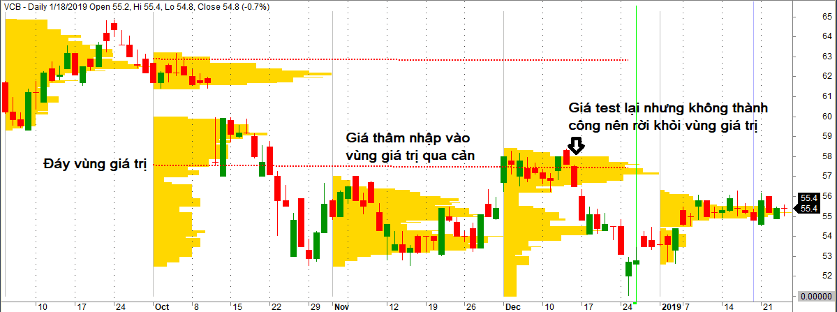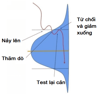 Giá sẽ đi từ phía trên và tiếp cận vào đỉnh vùng giá trị độ lệch chuẩn thứ hai (gọi tắt là VAH). Giá ban đầu sẽ phản ứng và nảy lên chứ chưa đâm xuống liền, sau đó mới xâm nhập vào để thăm dò và test lại VAH một lần nữa trước khi giảm mạnh.