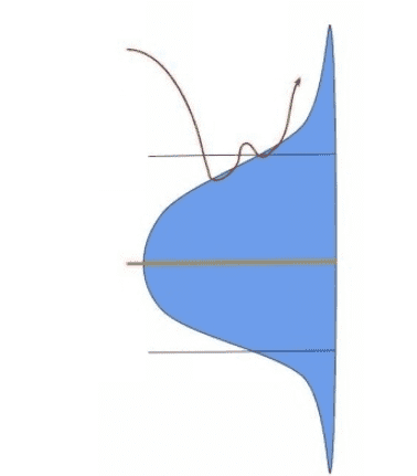 Hình trên là một dạng biểu đồ hình chuông thể hiện một phân phối chuẩn (normal ditribution) trong xác suất thống kê. Nói theo ngôn ngữ tài chính thì 68% khối lượng giao dịch sẽ nằm trong vùng độ lệch chuẩn thứ nhất. 95% khối lượng giao dịch sẽ nằm trong độ lệch chuẩn thứ hai. Và 99.7% sẽ nằm trong vùng độ lệch chuẩn thứ 3.
