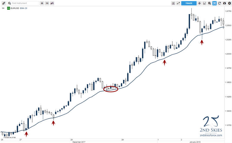 Dưới đây là một vài ví dụ về việc sử dụng EMA trong giao dịch, tất nhiên không đơn giản là giá cứ chạm đường EMA20 là bạn có thể buy/sell mà cần phải kết hợp phân tích thêm những yếu tố khác, đặc biệt là cấu trúc thị trường và đa khung thời gian.