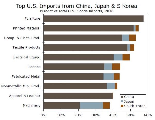 Nhưng Hoa Kỳ nhập khẩu hơn 50% sản phẩm máy tính và điện tử, một số trong đó được sử dụng làm đầu vào trung gian, từ Trung Quốc, Nhật Bản và Hàn Quốc. Ba quốc gia này cũng là nhà cung cấp quan trọng của thiết bị điện, nhựa, sản phẩm kim loại chế tạo và máy móc, để kể tên một số.
