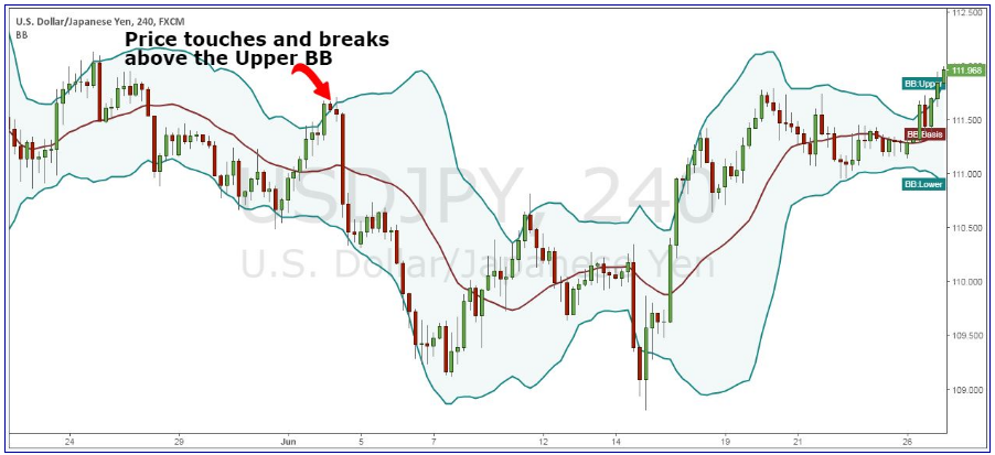 Yếu tố đầu tiên chúng tôi muốn xem xét cho chiến thuật Forex này là chúng ta cần thấy giá phải di chuyển đụng vào vùng Band trên (vùng quá mua).