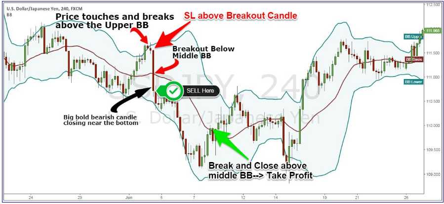Chúng ta sẽ đặt Stop Loss ở trên giá mở cửa của nến Breakout. Take Profit khi mà giá quay lại chạm đường Bollinger Bands.