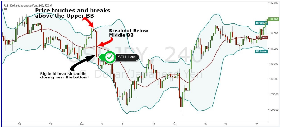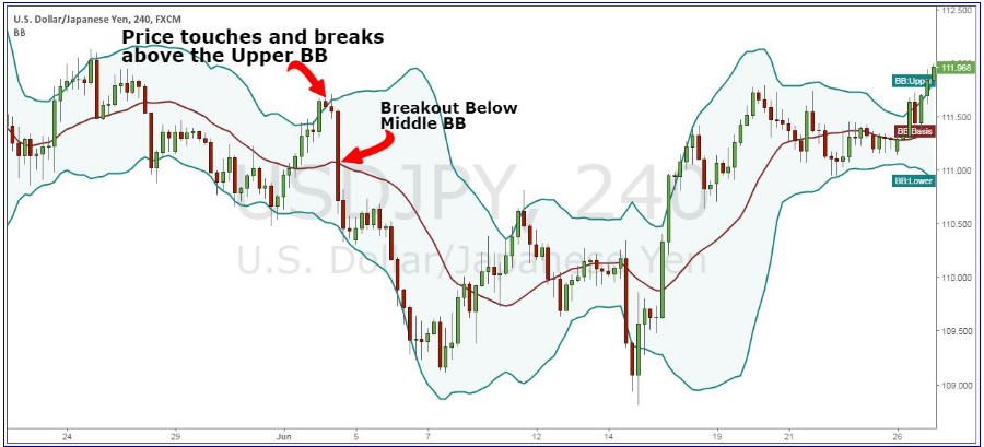 Sau khi giá chạm vào dải Bollinger Bands phía trên, chúng ta cần phải xác nhận rằng giá thực sự đi vào vùng quá mua và thị trường sắp đảo chiều. Suy nghĩ theo một cách Logic, thì hiện tượng Breakout đường giữa Bollinger Bands chính là tín hiệu thay đổi tâm lý thị trường một cách rõ ràng.