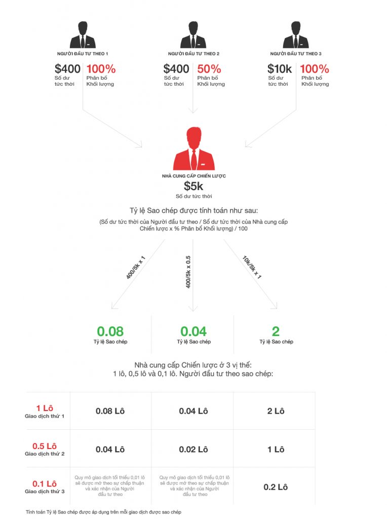 Như vậy, tùy thuộc vào số dư tài khoản của Nhà đầu tư theo và cài đặt tỷ lệ Phân bổ khối lượng, các giao dịch sẽ được sao chép với tỷ lệ tương ứng so với giao dịch gốc của Nhà cung cấp chiến lược.