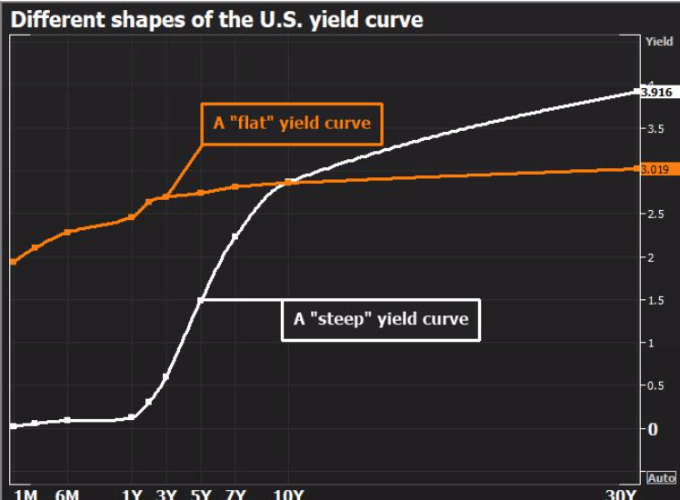 Xu hướng đường cong lợi suất phẳng đã khiến thị trường điều chỉnh từ cuối năm 2017 cho đến năm 2018, với việc Cục Dự trữ Liên bang (Fed) nâng lãi suất vào tháng 3, tháng 6 và tháng 9. Chênh lệch giữa trái phiếu 2 năm và 10 năm là khoảng 12 điểm cơ bản (một điểm cơ bản là 1% của 1%), giảm từ 79 điểm cơ bản vào tháng 2. Một số phần của đường cong lợi suất đảo ngược lần đầu tiên trong hơn một thập kỷ.