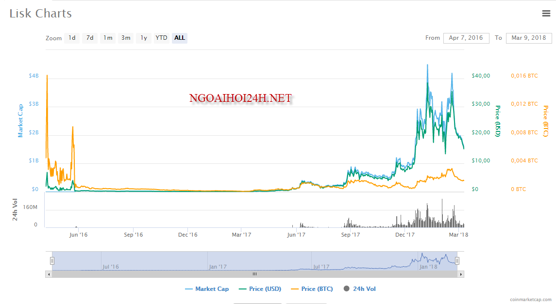 - chúng ta có thể thấy thời điểm tháng 5/2016 sau khi mới lên sàn giá một đồng Lisk có giá khoảng 2$/1 coin, và tăng nhẹ vào tháng 7/2016 sau đó giảm xuống còn 0.2$/1 coin mãi đến tận tháng 6/2017 sau hơn 1 năm đồng Lisk mới bắt đầu tăng trưởng trở lại, và đỉnh điểm là và tháng 1/2018 Lisk có giá là 31$/1 coin tăng rất nhiều lần so với lúc mới lên sàn, tuy nhiên thời điểm mình viết bài viết này giá của Lisk (LSK) có đang giảm 1 chút do ảnh hưởng của đồng BTC. Nhưng đây có lẽ sẽ là cơ hội cho những ai mua và sở hữu đồng tiền điện tử Lisk này.