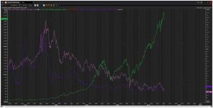 Hình 2. Mối quan hệ giữa TPCP Mỹ 10 năm và SP500. Màu xanh: S&P500 – Màu tím nhạt: Lợi suất danh nghĩa – Màu tím đậm: CPI của Mỹ