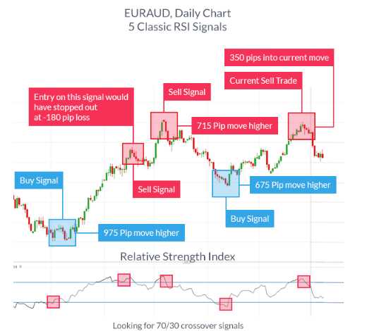 Vì RSI là một chỉ báo động lượng, nó được định mức trong khoảng từ 0 tới 100. Giá trị 100 được coi là mức quá mua và có khả năng đảo chiều xuống trong khi giá trị 0 được coi là quá bán và sẽ có khả năng cao đảo chiều đi lên. Nếu xu hướng chủ đạo là tăng, bạn sẽ muốn xác định sự đảo chiều của RSI từ các giá trị dưới 30 hoặc quá bán để vào lệnh theo xu hướng.