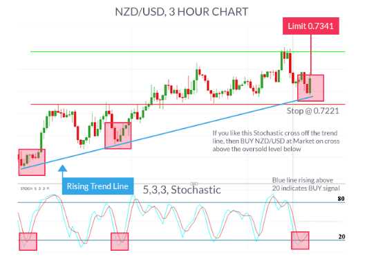 Bởi vì các chỉ báo động lượng có cùng thang đo mức quá mua và quá bán, bạn đơn giản chỉ cần tìm kiếm tín hiệu đường %K cắt đường %D qua mức 20 để xác định một tín hiệu mua hợp lý.