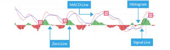 Sau khi đã xác định được bối cảnh thị trường là giao dịch trong phạm vi hay theo xu hướng, có 2 tín hiệu bạn cần để ý khi sử dụng chỉ báo này. Một là bạn cần nhận ra vị trí của các đường so với đường 0 (zero line) để xác định xu hướng lên hoặc xuống của các cặp tiền. Thứ hai bạn cần xác định sự giao cắt lên hoặc xuống của đường MACD (đỏ) và đường tín hiệu (xanh) để vào lệnh mua hoặc bán tương ứng.