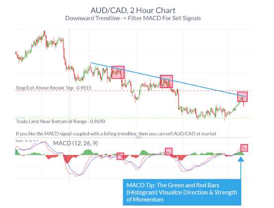 Giống như tất cả các chỉ báo khác, MACD kết hợp tốt nhất khi thị trường đang trong một xu hướng hoặc giao dịch trong phạm vi. Khi đã xác định được xu hướng, tốt nhất bạn nên xác định các điểm giao cắt theo xu hướng. Khi vào lệnh, bạn có thể đặt cắt lỗ ở trên vùng đỉnh trước khi tín hiệu giao cắt hình thành, và đặt điểm chốt lời sao cho lợi nhuận = 2 lần rủi ro.