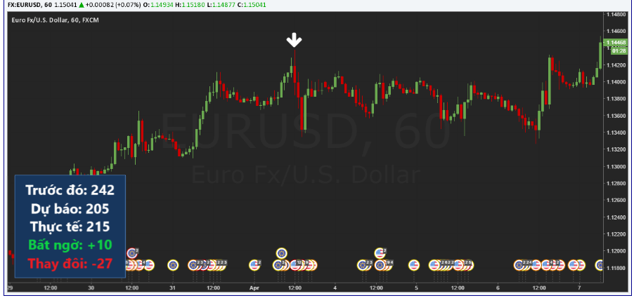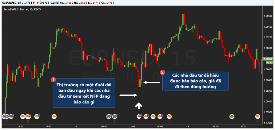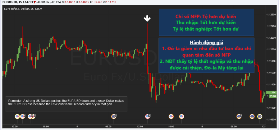 Hình ảnh bên dưới là một ví dụ: NFP tốt hơn dự kiến, nhưng tệ hơn so với tháng trước. Tỷ giá EURUSD ban đầu giảm vì đồng Đô-la Mỹ mạnh bởi các phản ứng ban đầu, nhưng sau đó lại tăng khi các nhà đầu tư hiểu rằng kết quả báo cáo không tích cực.