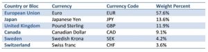 Bảng liệt kê 6 loại tiền tệ tạo nên USD index và tỷ giá phần trăm tương ứng: