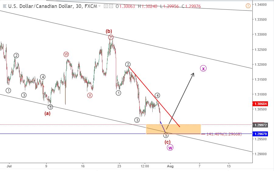 Trong hai bản cập nhật cuối cùng về USDCAD, chúng tôi đã sử dụng hai phương pháp phân tích kỹ thuật khác nhau. Lý thuyết sóng Elliott và phân tích mô hình hài hòa. Theo phân tích mô hình hài hòa, mô hình Gartley tăng giá sắp kết thúc ở 1.2968-1.3. Tại cùng một khu vực, một mô hình zigzag sóng Elliott cũng có thể kết thúc có nghĩa là USDCAD có thể tăng điểm trong những ngày tới. Mặc dù cuộc tăng giá có thể không dẫn đến sự thay đổi xu hướng theo bản cập nhật phân tích sóng Elliott cuối cùng, nhưng một đợt tăng mạnh có nhiều khả năng sẽ xảy ra. Biểu đồ bên dưới được sử dụng trong lần cập nhật cuối cùng .