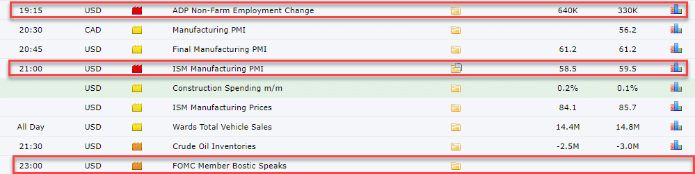 Trong tuần này thì dữ liệu Bảng lương Nonfarm – Phi nông nghiệp là quan trọng nhất được công bố vào thứ 6. Trước đó, là hôm nay thì thị trường sẽ tập trung vào bảng lương ADP và PMI sản xuất. Dữ liệu này có thể sẽ cung cấp một số manh mối về bảng lương Nonfarm thực tế có thể diễn ra.