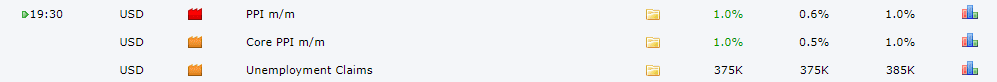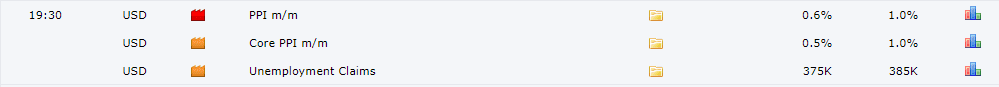 Hôm nay thị trường sẽ chú ý đến dữ liệu PPI và số đơn xin trợ cấp thất nghiệp từ Hoa Kỳ vào 19:30. Theo đó dữ liệu PPI được dự báo giảm xuống 0.6% từ mức 1% và phiên bản cốt lõi của PPI cũng được dự báo giảm xuống 0.5% so với 1%. Dự báo xấu cho đồng USD.