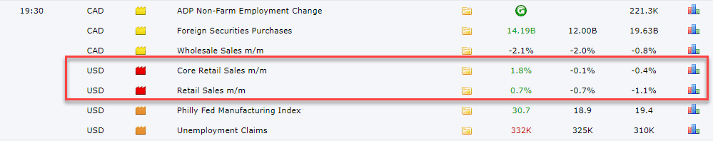Dữ liệu bán lẻ Hoa Kỳ công bố hôm qua là rất ấn tượng. Dữ liệu “XANH RỜN” đã khiến Vàng chịu áp lực giảm mạnh trước bối cảnh FOMC có cuộc họp vào tuần tới.