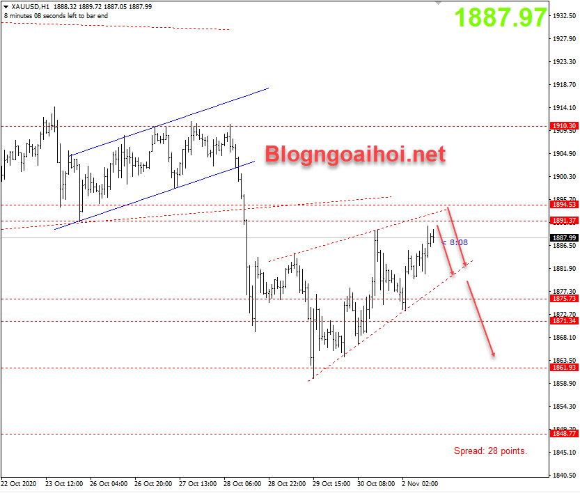 Chiến lược tham khảo : Vàng phiên mỹ 2/11 – Bán lệnh 1 ở 1890, lệnh 2 ở 1895, Stop 1898, TP 1880-1870.