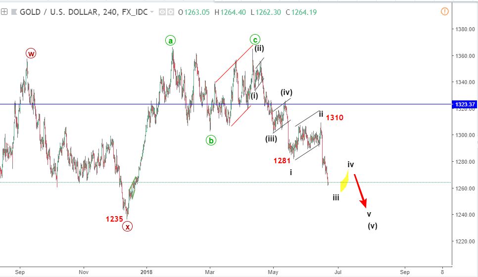 Vàng 22/6– Vàng tiếp tục xu hướng giảm từ tháng Tư, phá vỡ ngưỡng hỗ trợ 1280. Giá sẽ chạm ngưỡng hỗ trợ tiếp theo tại 1235? Sau đây phân tích sóng vàng ngày 22/6 theo sóng elliott wave cung cấp cho các đầu mối kỹ thuật hữu ích dựa trên lý thuyết sóng Elliott.