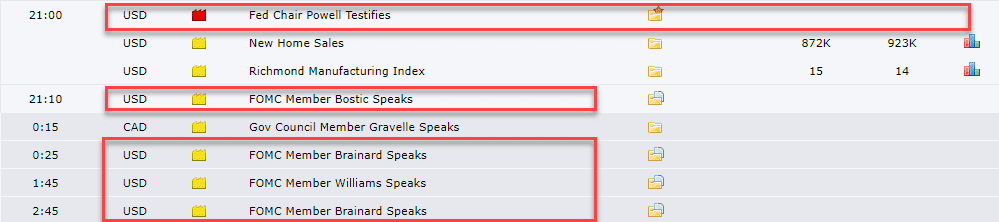 Bộ trưởng Tài chính Hoa Kỳ Yellen và Chủ tịch Fed Powell điều trần trước Ủy ban Dịch vụ Tài chính Hạ viện vào lúc 21:00. Hôm nay có nhiều bài phát biểu của các thành viên của Fed nhất là phiên điều trần của Yellen và Powell sẽ có thể có các biến động lớn của thị trường các nhà đầu tư nên hết sức chú ý.