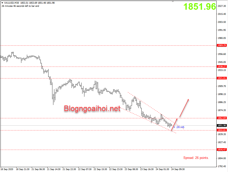 Trong lần cập nhật trước, chúng tôi có đề cập đến vùng mua Vàng ở quanh 1850. Và Vàng đã bật lên từ 1848.8 lên 1877 vào đêm qua. Biểu đồ dưới đây được sử dụng cho lần cập nhật trước.