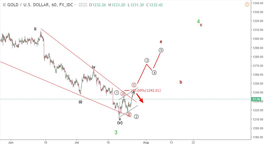 Vàng 26/7– Vàng đang phá vỡ 1230 hướng lên 1240 và có thể hoàn thành một mô hình điều chỉnh. Phân tích sóng vàng Elliott ngày 26 tháng 7 sau đây xem xét những gì có thể xảy ra tiếp theo dựa trên lý thuyết sóng Elliott.