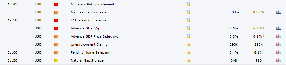 Hôm nay thì có khá nhiều các dữ liệu kinh tế quan trọng được công bố như : Dữ liệu GDP, số đơn xin trợ cấp thất nghiệp, doanh số nhà chờ bán… Lãi suất và chính sách tiền tệ của ECB nhà đầu tư cũng cần lưu ý.