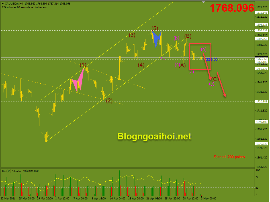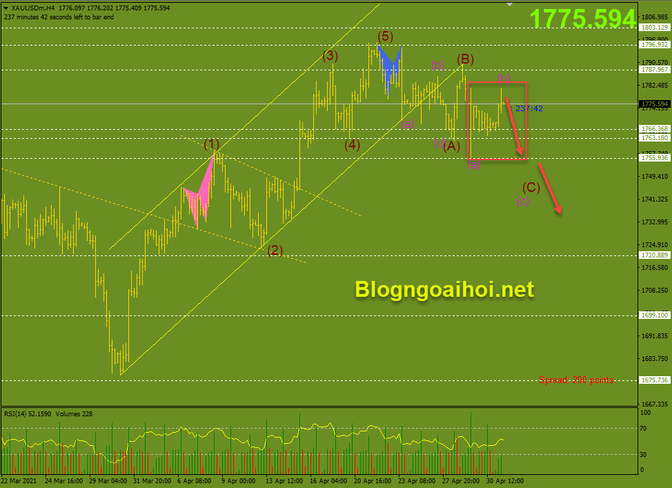 Tuy nhiên chúng tôi kỳ vọng có một đợt sụt giảm của Vàng để hoàn thiện nốt sóng (c) của (C). Vàng có thể phá vỡ vùng hỗ trợ 1755 để mở rộng đà giảm sâu hơn.