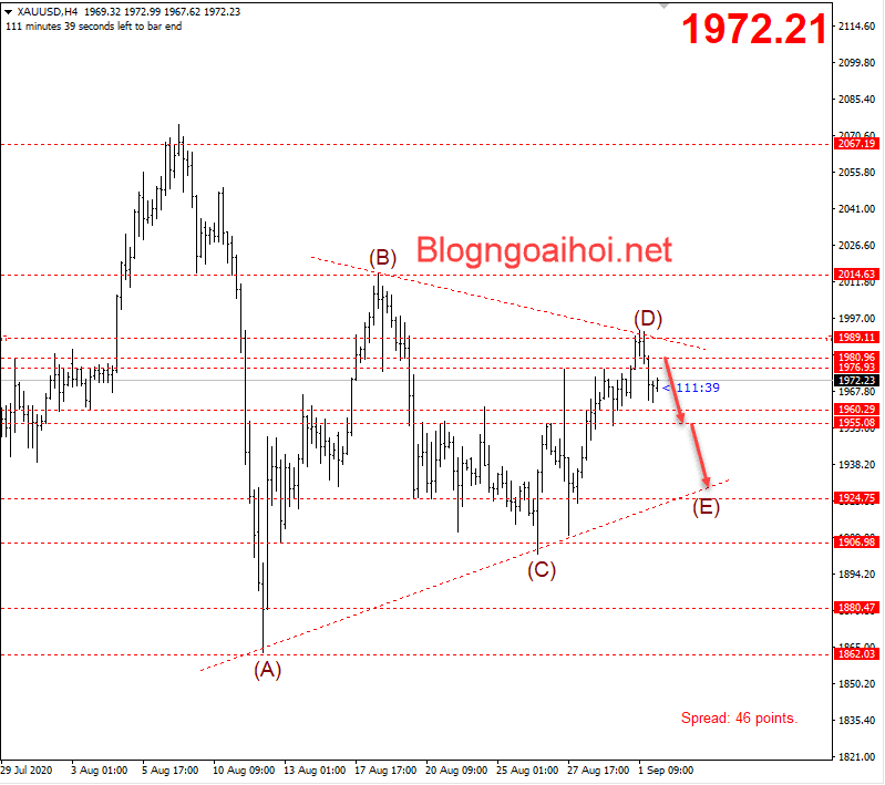 Hiện Vàng đang di chuyển xuống vùng cạnh dưới của mô hình tam giác để hình thành nốt sóng (E). Có thể có đợt tăng mới của Vàng ở quanh vùng 1930.
