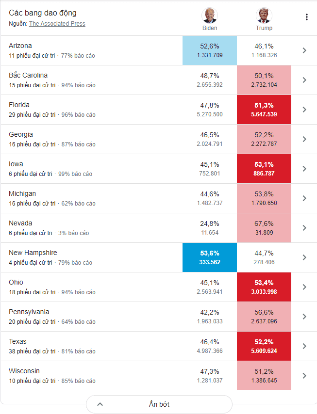 Hiện chỉ còn 10 bang chưa công bố thắng thua, dù ứng cử viên đảng Dân chủ Biden đang tạm dẫn trước về số phiếu đại cử tri và tổng số phiếu bầu, tổng số phiếu đại cử tri và xu hướng bỏ phiếu ở các bang còn lại đều không tốt cho Biden.