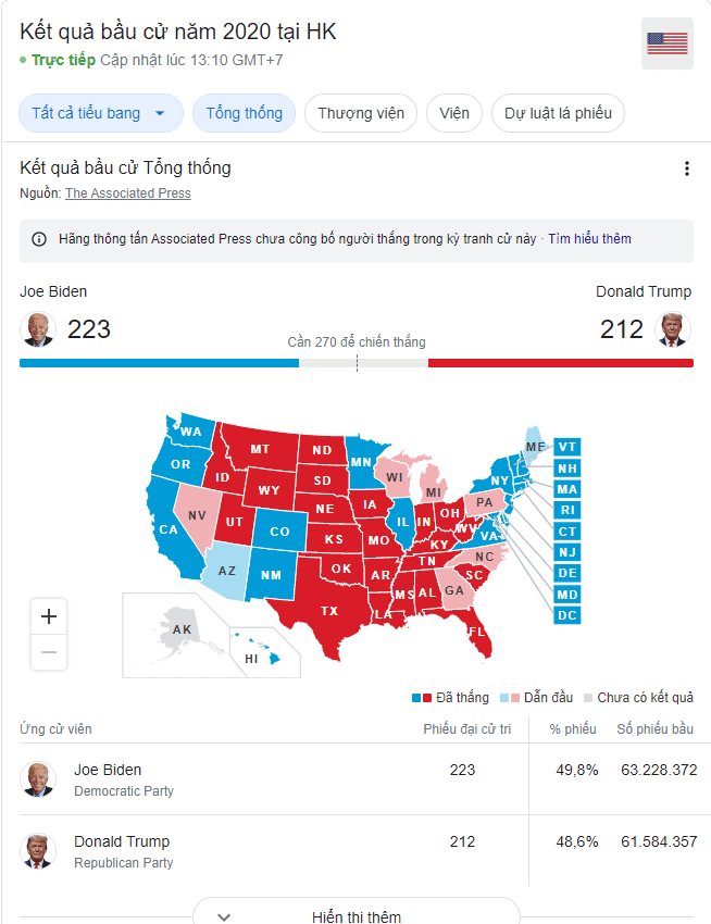 Tính đến thời điểm hiện tại 13:10 thì Ông biden vẫn đang dẫn đầu về số phiếu đại cử tri là 223 so với ông Trump là 212.