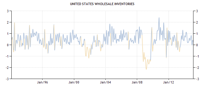 Hàng tồn kho bán buôn tại Hoa Kỳ tăng 0,30% trong tháng hai năm 2015 so với tháng trước. Hàng tồn kho bán buôn tại Mỹ trung bình 0,40% từ năm 1992 đến năm 2015, đạt mức cao nhất là 2,38% trong tháng Mười năm 2010 và mức thấp kỷ lục -2,07% vào tháng Ba năm 2009.