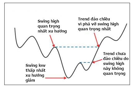 Xu hướng giảm sẽ kết thúc khi giá phá vỡ đỉnh swing high tạo ra đáy swing low thấp nhất của xu hướng. Hãy chú ý cụm từ swing high tạo ra đáy swing low cao nhất, đó là vị trí rất đặc biệt trong xu hướng giảm.