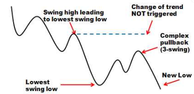 Tương tự, nếu giá thất bại khi phá vỡ đỉnh swing high quan trọng nhất xu hướng giảm, thị trường sẽ hình thành complex pullback hơn là đảo chiều thị trường.