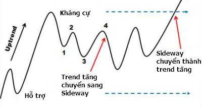 Sau khi hình thành đến 4 điểm swing point mà giá vẫn chưa tạo ra đỉnh mới cao hơn hay đáy mới thấp hơn, thị trường chuyển sang sideway và lấy các mức kháng cự hỗ trợ làm mốc xác định vùng sideway của thị trường.