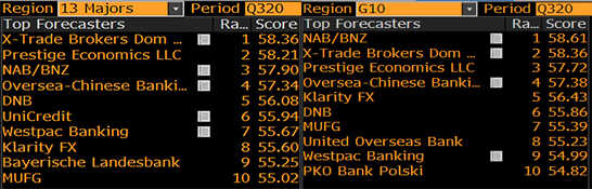 Bảng xếp hạng Bloomberg được xem là uy tín nhất trong lĩnh vực tài chính. Kết quả được cập nhật hàng quý dựa trên các dự báo được công bố trong 12 tháng trước đó bởi các tổ chức tài chính toàn cầu lớn nhất như Barclays, BNP Paribas, JP Morgan và Westpac. Kết quả mới nhất của bảng xếp hạng vừa được công bố vào cuối quý 3/2020, tổng hợp những dự báo chính xác nhất trong vòng 12 tháng trước đó.